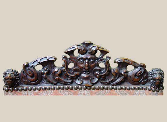 Nußbaum ornamental und figural beschnitzt, alte Patina. Bezug später.